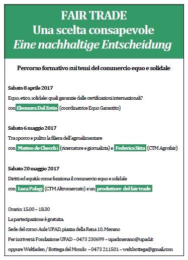20. Aprile 2017FAIR TRADE- Una scelta consapevolePer maggiori informazioni: http://www.upad.it/Chi-siamo/Fondazione-UPAD/Corsi/FAIR-TRADE-SEDE-DI-MERANO